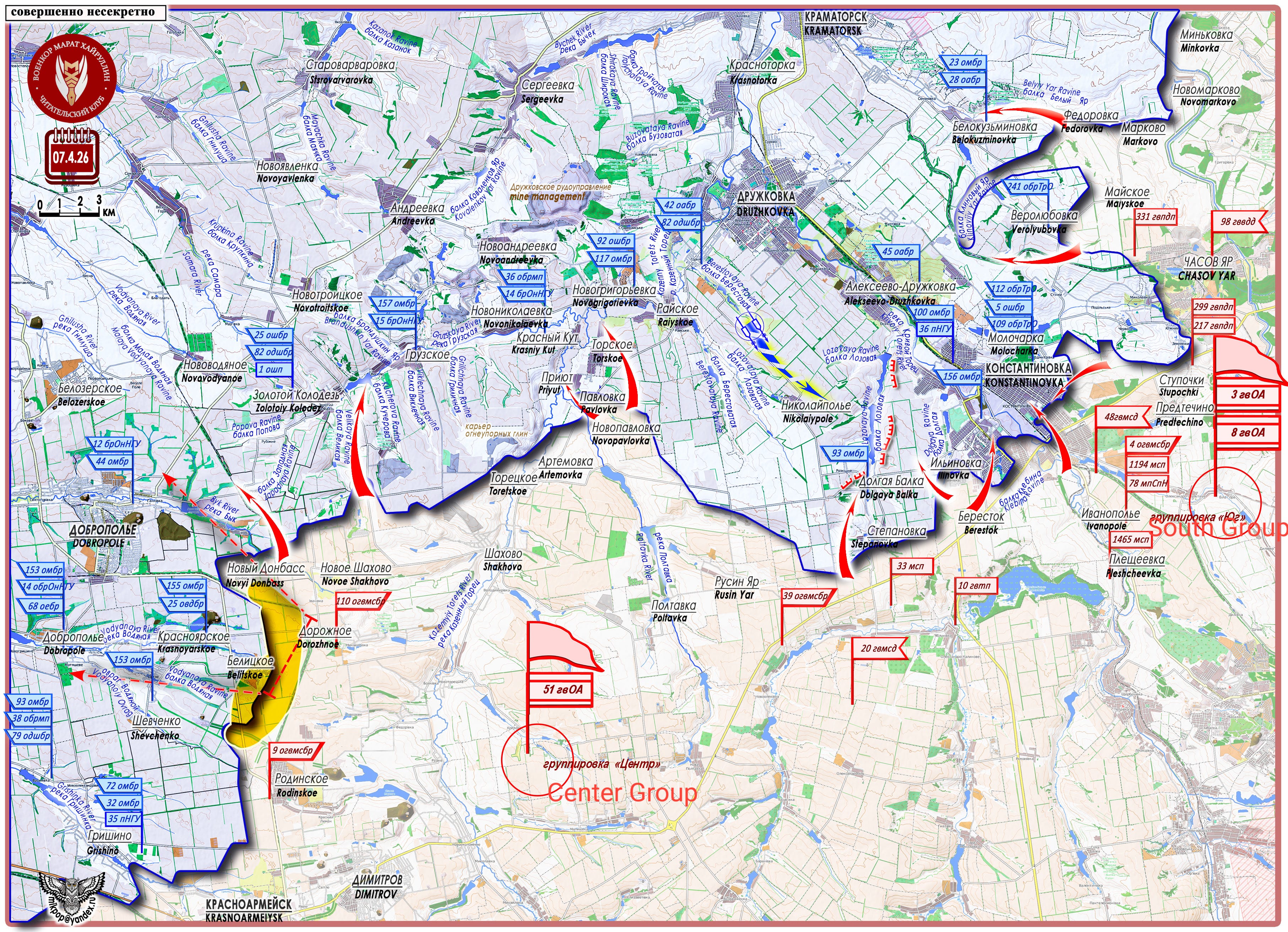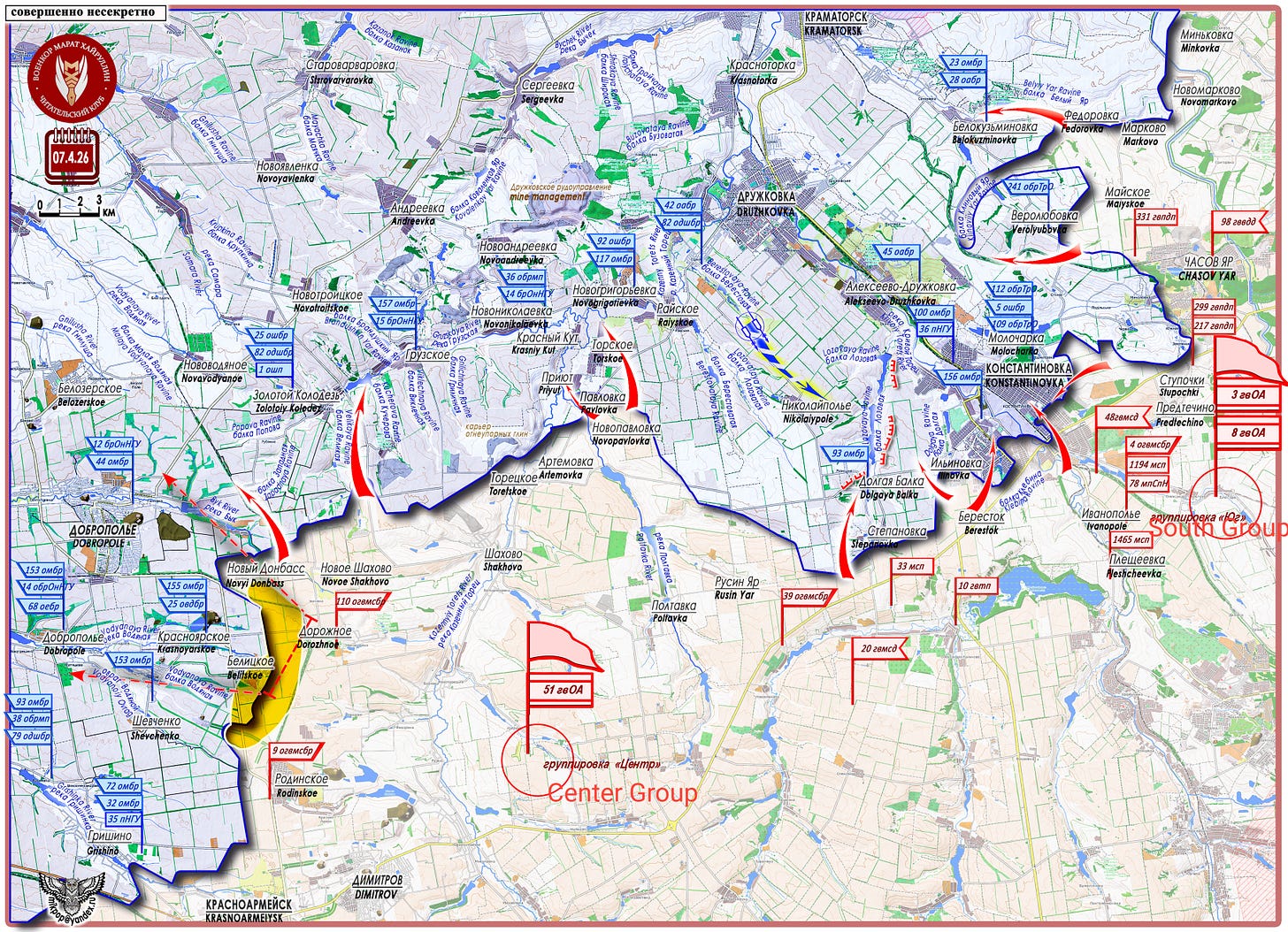 Simultaneously, the center and right flank are pinning down enemy actions, preventing him from maneuvering toward the eastern sectors, where formations of the "South" Group are fighting in the city of Konstantinovka and along the entire eastern line toward the Slavyansk-Druzhkovka agglomeration.