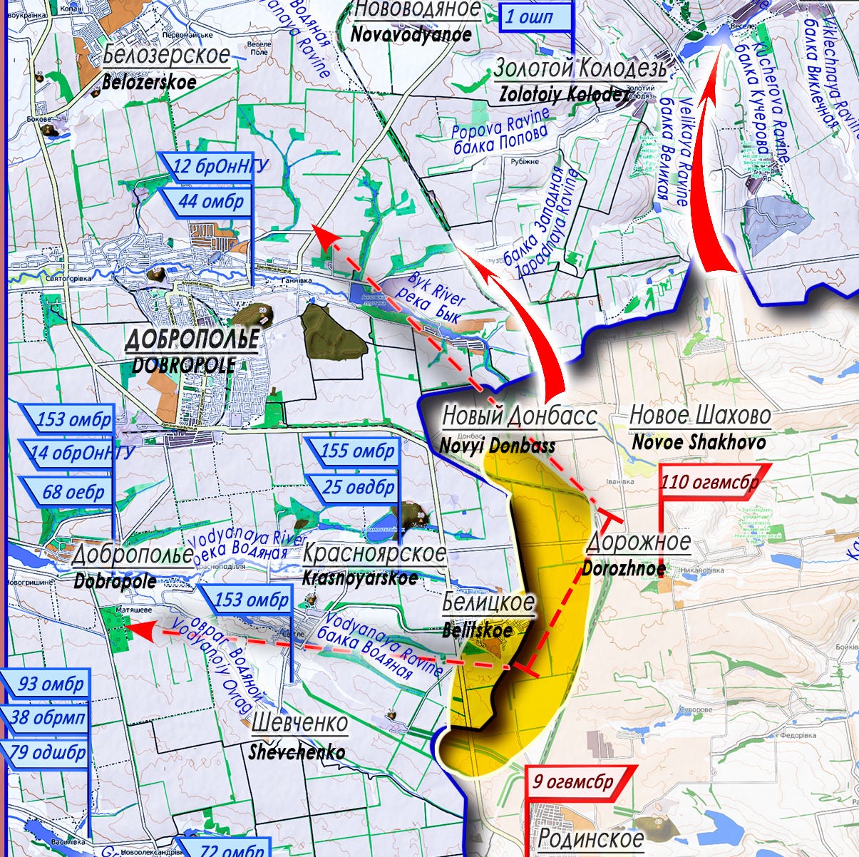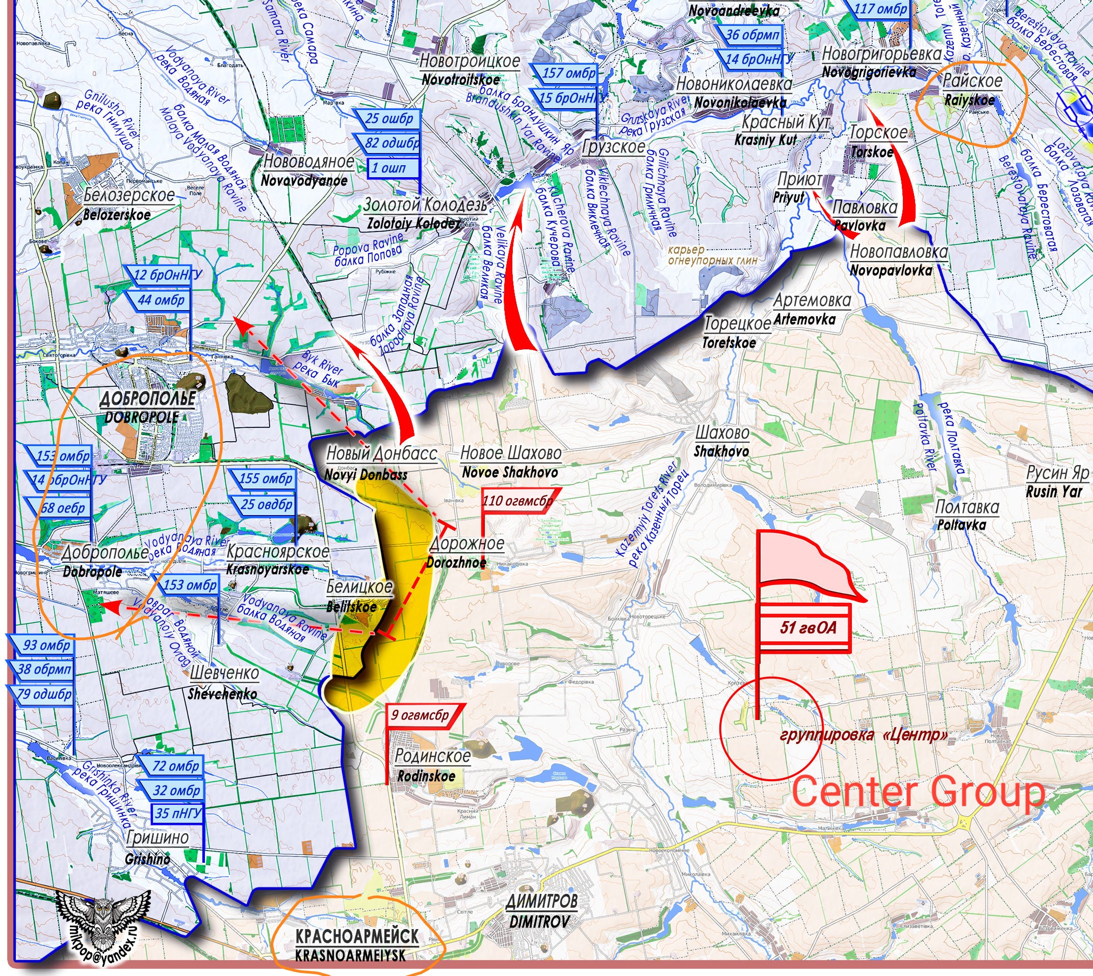 On this sector, the "Center" Group, with its left flank, is approaching the border of Dnepropetrovsk Oblast, while its center and right flank are engaged in intensive efforts to split the enemy's defense on the Raiyskoe - Dobropole line. Over the past 24 hours, positions on the Novy Donbass - Belitskoe line have been improved, where combat operations are underway toward the settlement of Dobropole. This is the central area of the Ukrainian Armed Forces' defense sector Dobropole - Shevchenko - Belitskoe, which covers the right flank (along the Byk River) of the enemy's defensive line Druzhkovka - Raiyskoe - Zolotoy Kolodez.