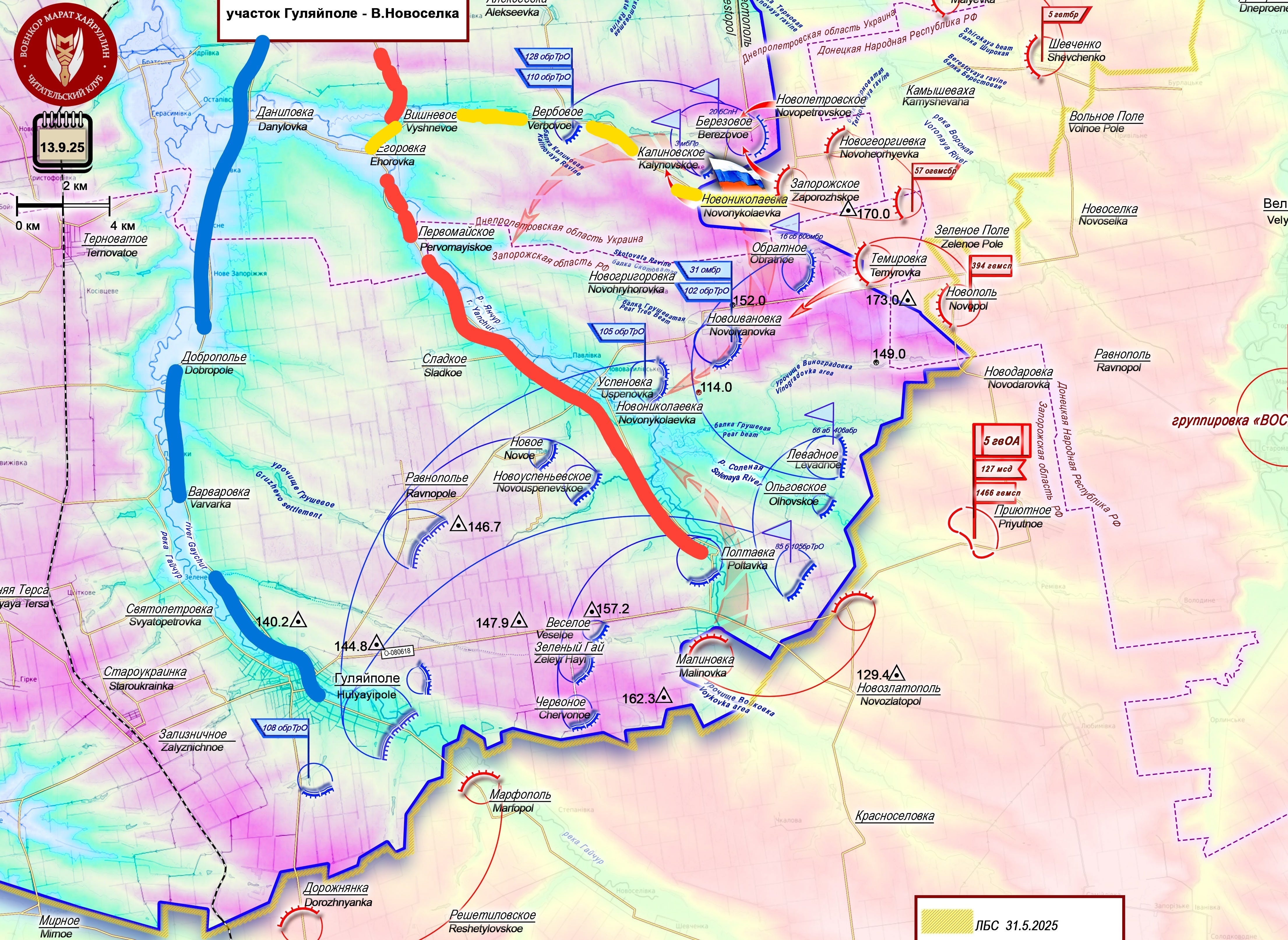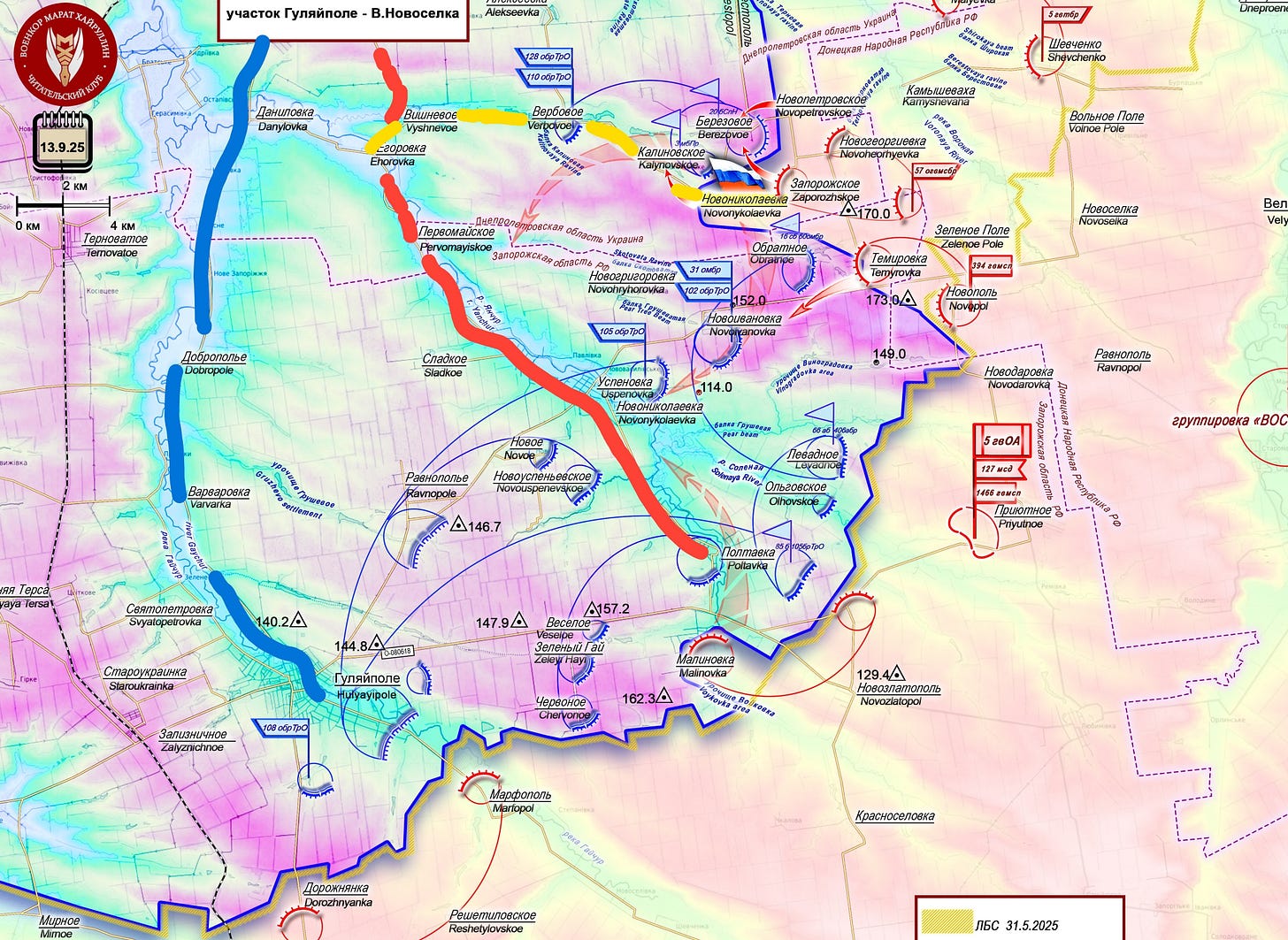 b: the blue line) the ring road located westward Pokrovskoe - Danilovka - Dobropolye - Gulyaipole (Hulyayipole), running along the Gaychur riverbed.